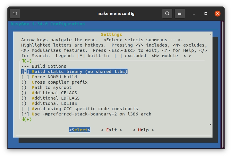 $ make -j4busybox is an executable file - /bin/busybox that contains a set of standard tools like coreutils. In the busybox menu we need to enable: Build BusyBox as a static binary (no shared libs) option: